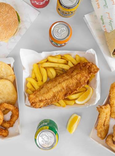 1 x Flake, 2 x Calamari Rings, 2 x Scallops, 1 x Seafood Stick with 1 x Small Bag of Chips.